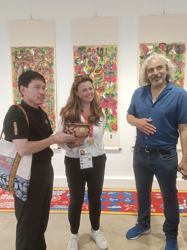 7月25日,在法國巴黎,來自三門峽市的王新軍(左)與現代奧林匹克運動會之父顧拜旦的曾孫女黛安·德·納瓦塞爾·德·顧拜旦夫人(中)進行文化交流。王新軍作為仰韶彩陶制作技藝的領軍人物,他精心制作了“花開奧運”經典彩陶盆與廟底溝花瓣紋彩陶盆,參加此次巴黎奧運文化體育交流活動。